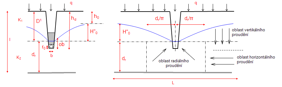 Platnost 1) dvouvrstvý profil; drén je v horní vrstvě 2) dvouvrstvý profil; drén je ve spodní vrstvě buď v horní nevo dolní vrstvě, kdy: K-horní < K-dolní
